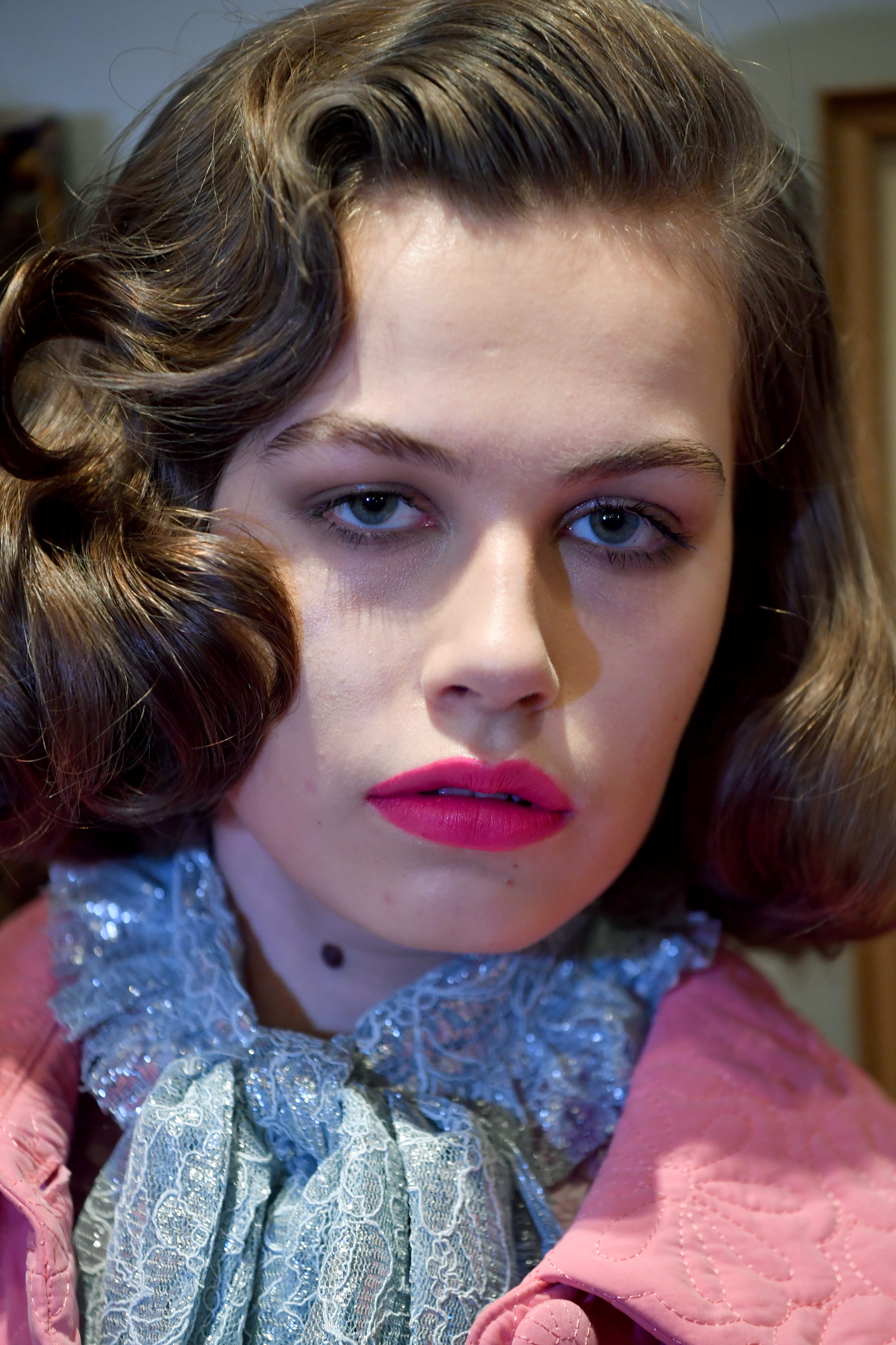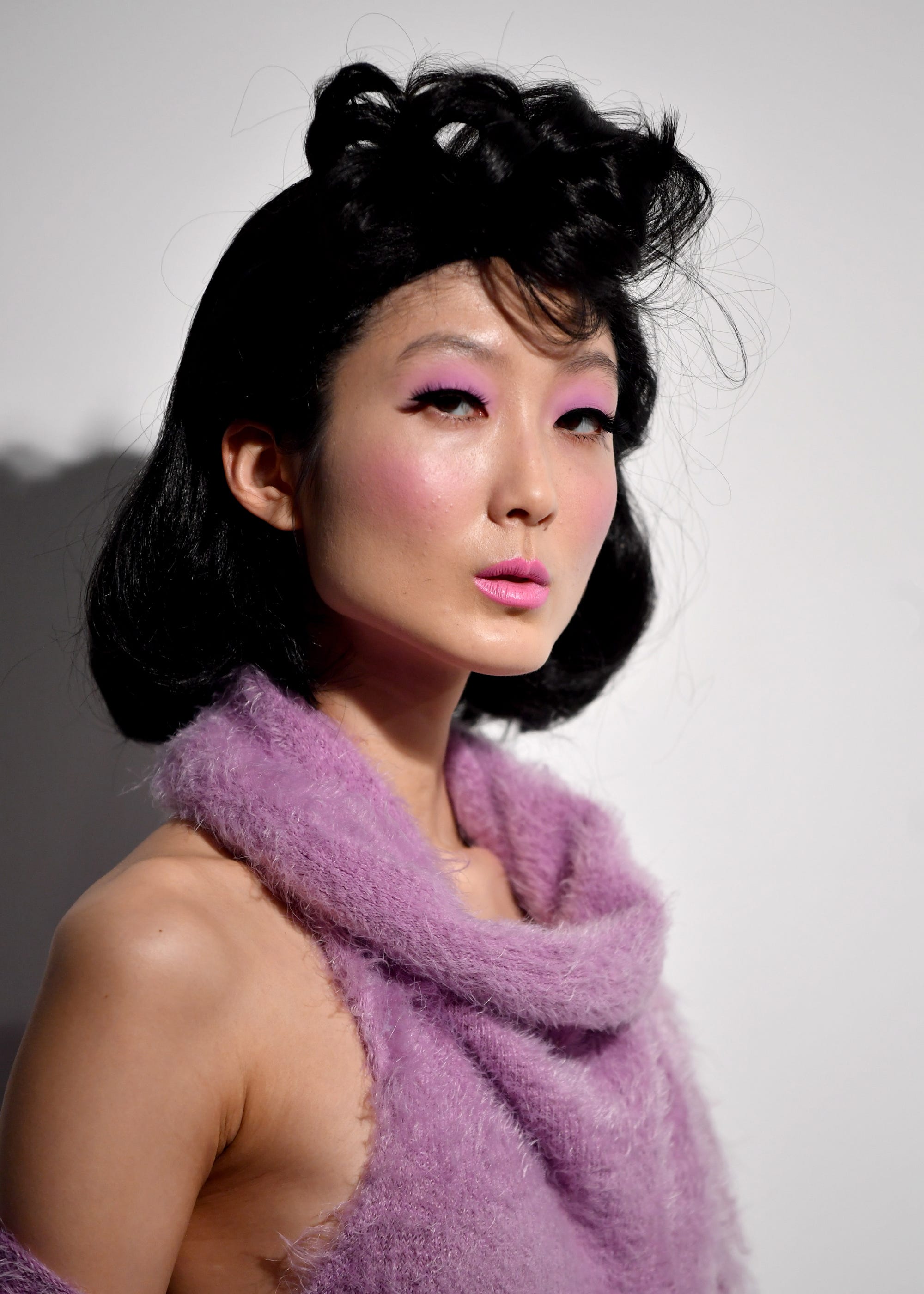 Ryan Lo brought back the pompadour, or Elvis quiff, for his AW19 show, as well as classic finger waves, but the makeup took its cue from another era. Pablo Rodriguez, director of artistry for Illamasqua, dressed lips in '80s-inspired hot pink using the shade Eurydice and washed eyes in gunmetal grey eyeshadow.