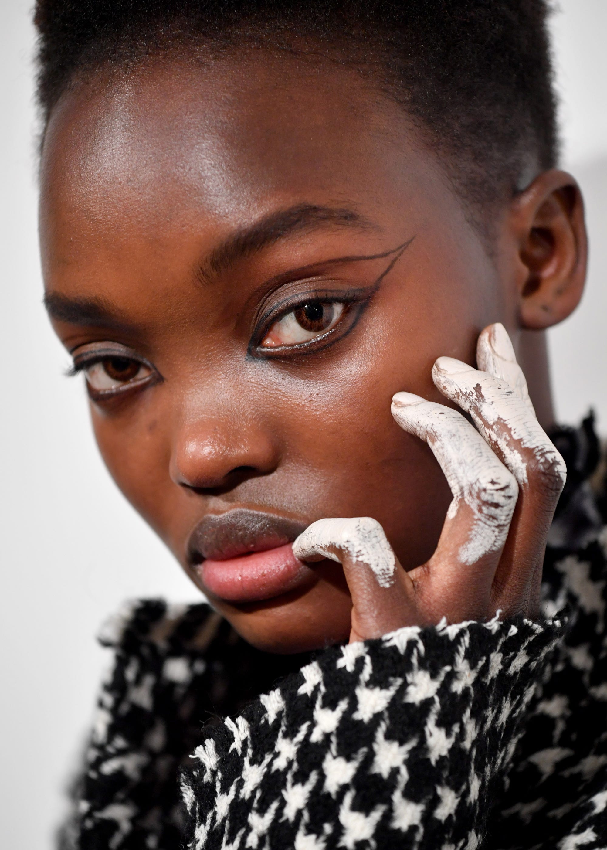 Monochrome beauty reigned supreme at ASAI, with models wearing thinly drawn, negative space-inspired winged eyeliner by makeup artist Thomas de Kluyver. Courtesy of Sylvie Macmillan, nail art was taken to the extreme with chalky, white paint-dipped fingers and gold leaf.