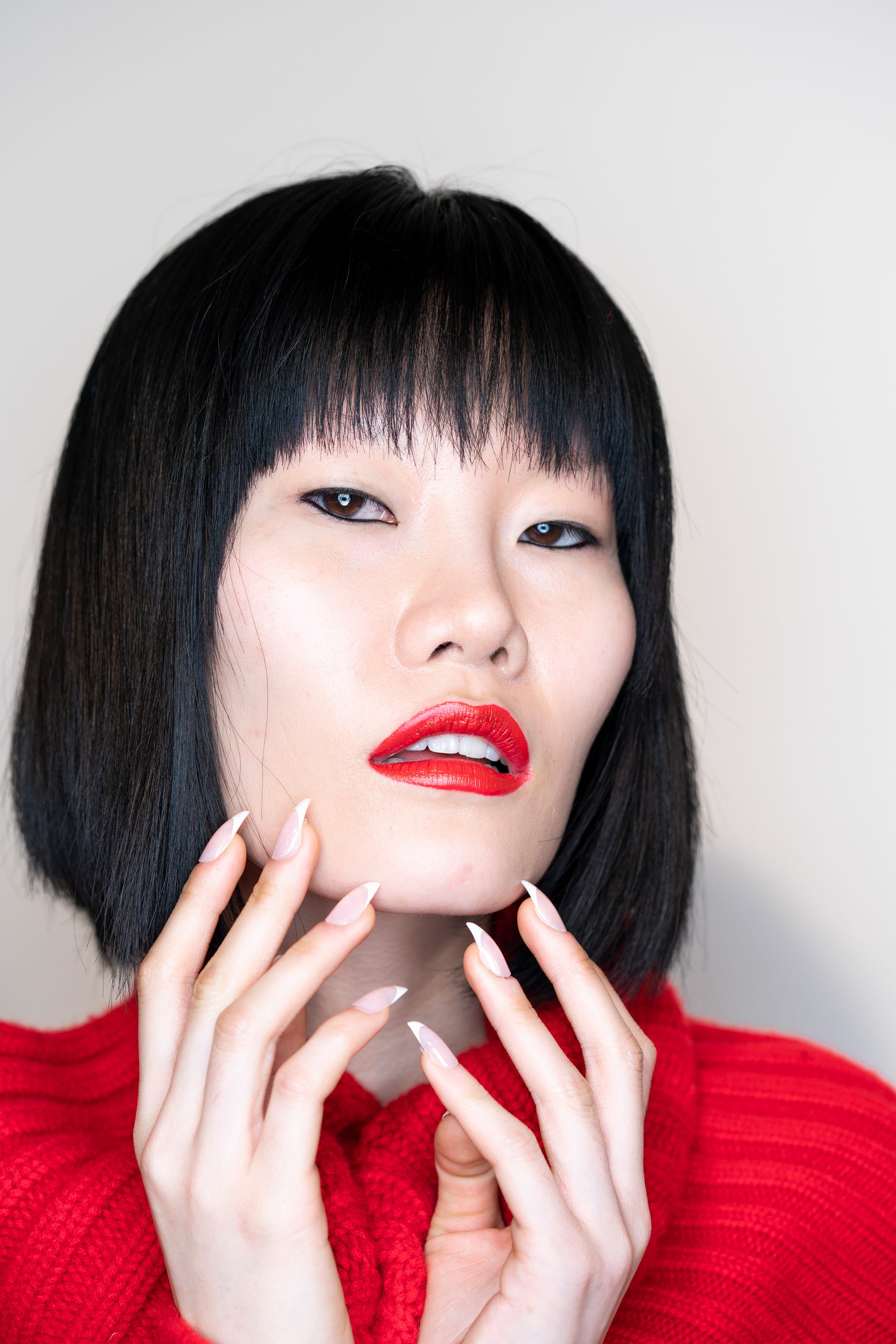 Twisted ponytails and sleek bobs was the hair story at Marta Jakubowski. On makeup, Illamasqua’s director of artistry Pablo Rodriguez ditched wings and smudged kohl for a single ring of eyeliner around the entire eye and offset the look with a blood red lip. The classic nude and white French manicure was also given an edge with asymmetric, almost claw-like tips.