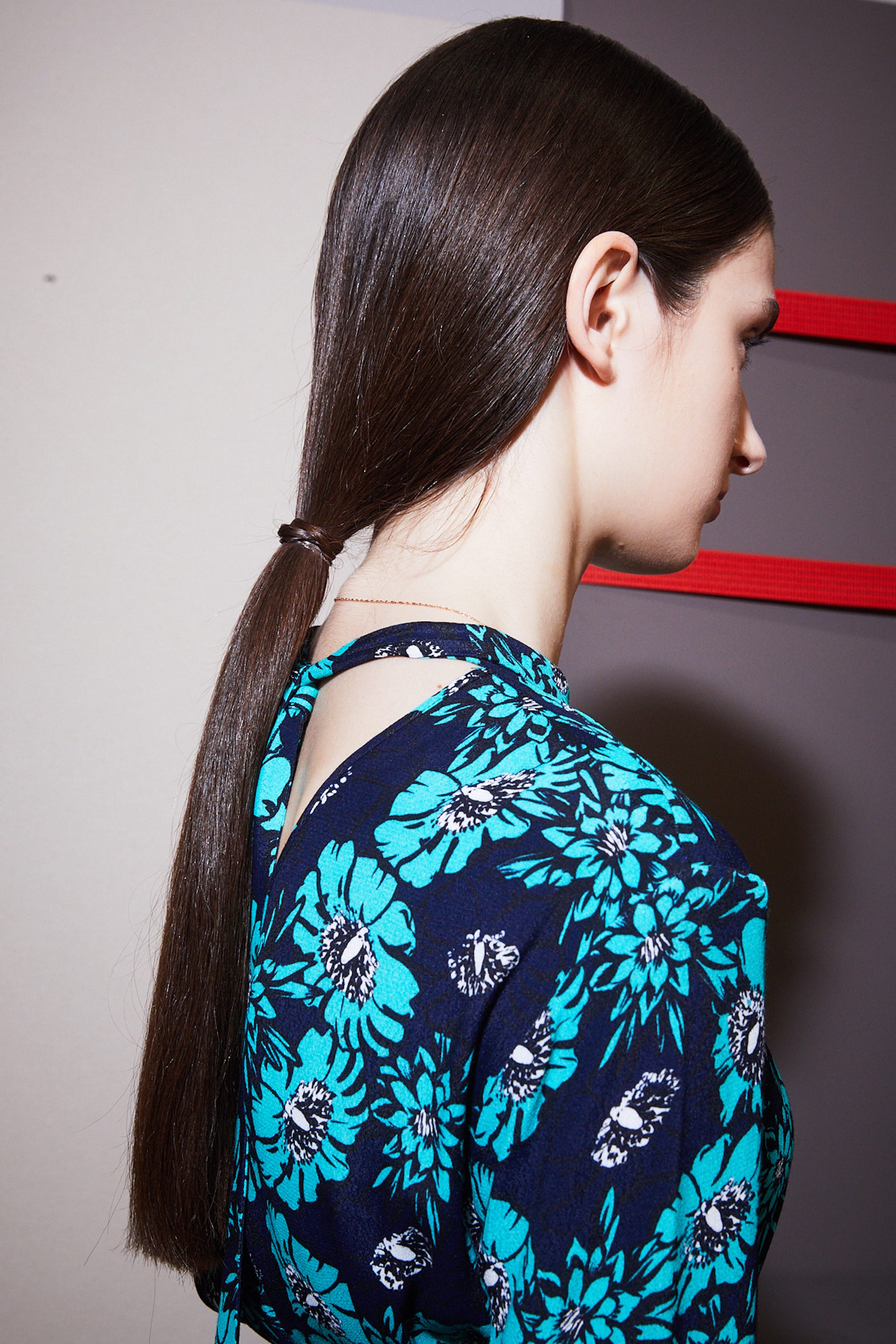 “Here we need to see some neck," said hairstylist Tina Outen. "The collection is about huge trapper hats and oversized scarves so hair is easy and effortless to offset the accessories." Tina sprayed L’Oréal Professionnel Tecni.Art Volume Lift generously onto damp hair and then L’Oréal Professionnel Tecni.Art Liss Control Plus to the ends which she then blow-dried smooth. She broke the style down with her hands and a little L’Oréal Professionnel Tecni.Art Depolish on the mid-lengths and ends so that the ponytail had some matte texture. Finally, she secured hair with a tie and wrapped a piece of hair around the base of the ponytail.
