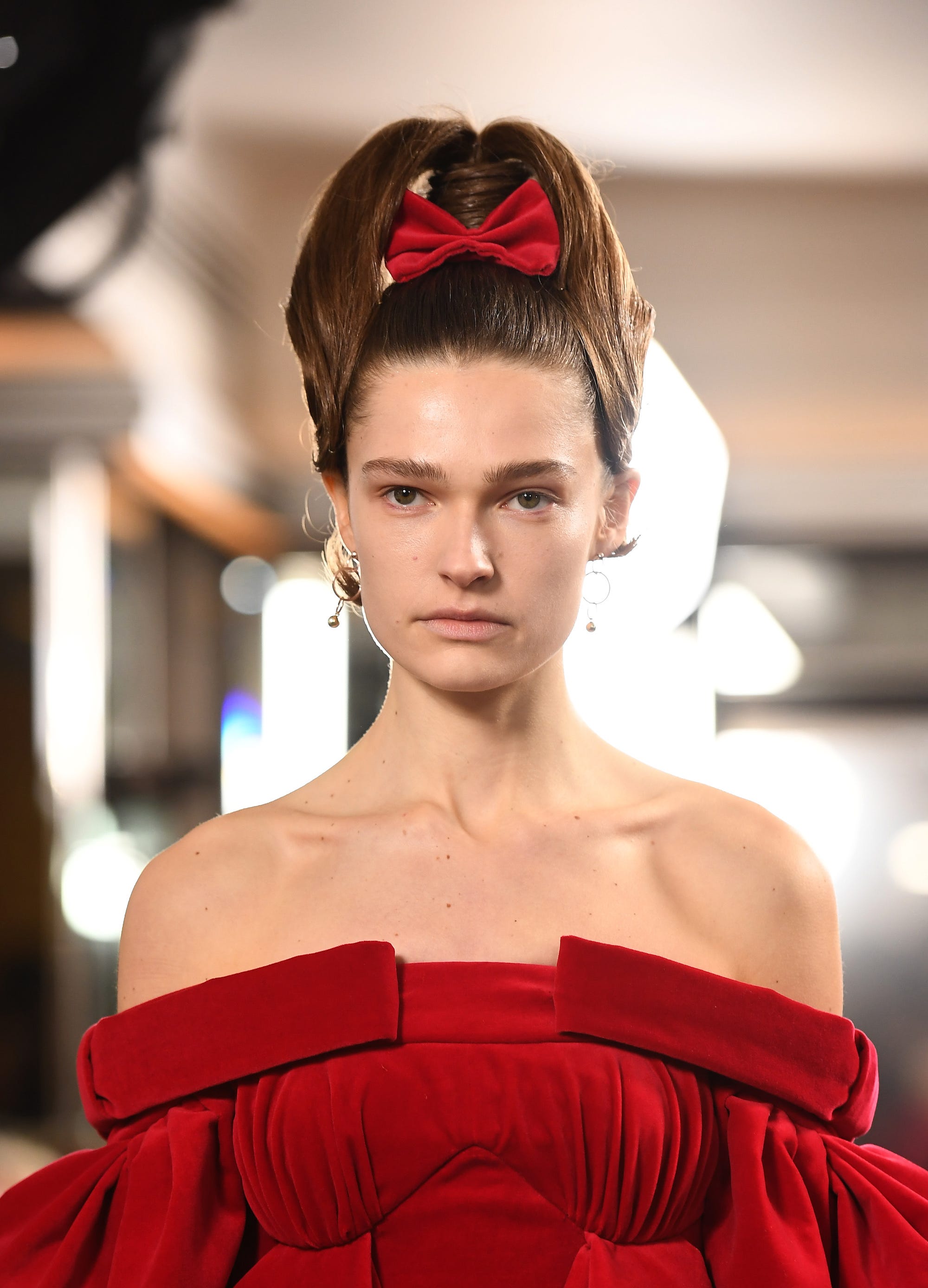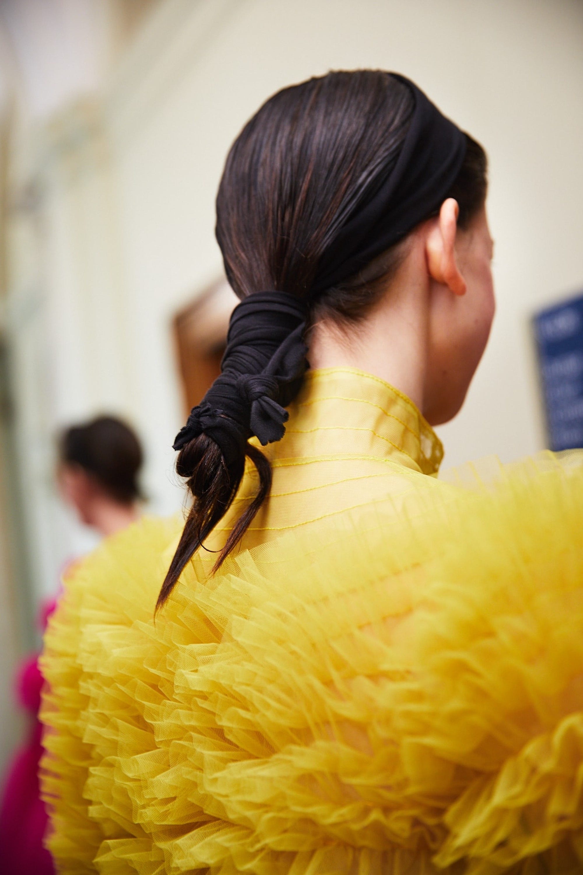 The hair was something else, thanks to Oribe and Dyson. Lengths were blowdried upwards into a tight ponytail, then hairstylists attached a piece of gauze to the base for padding before tying a piece of hair around it for a seamless finish. The vibe was Italian chic, inspired by The Godfather.