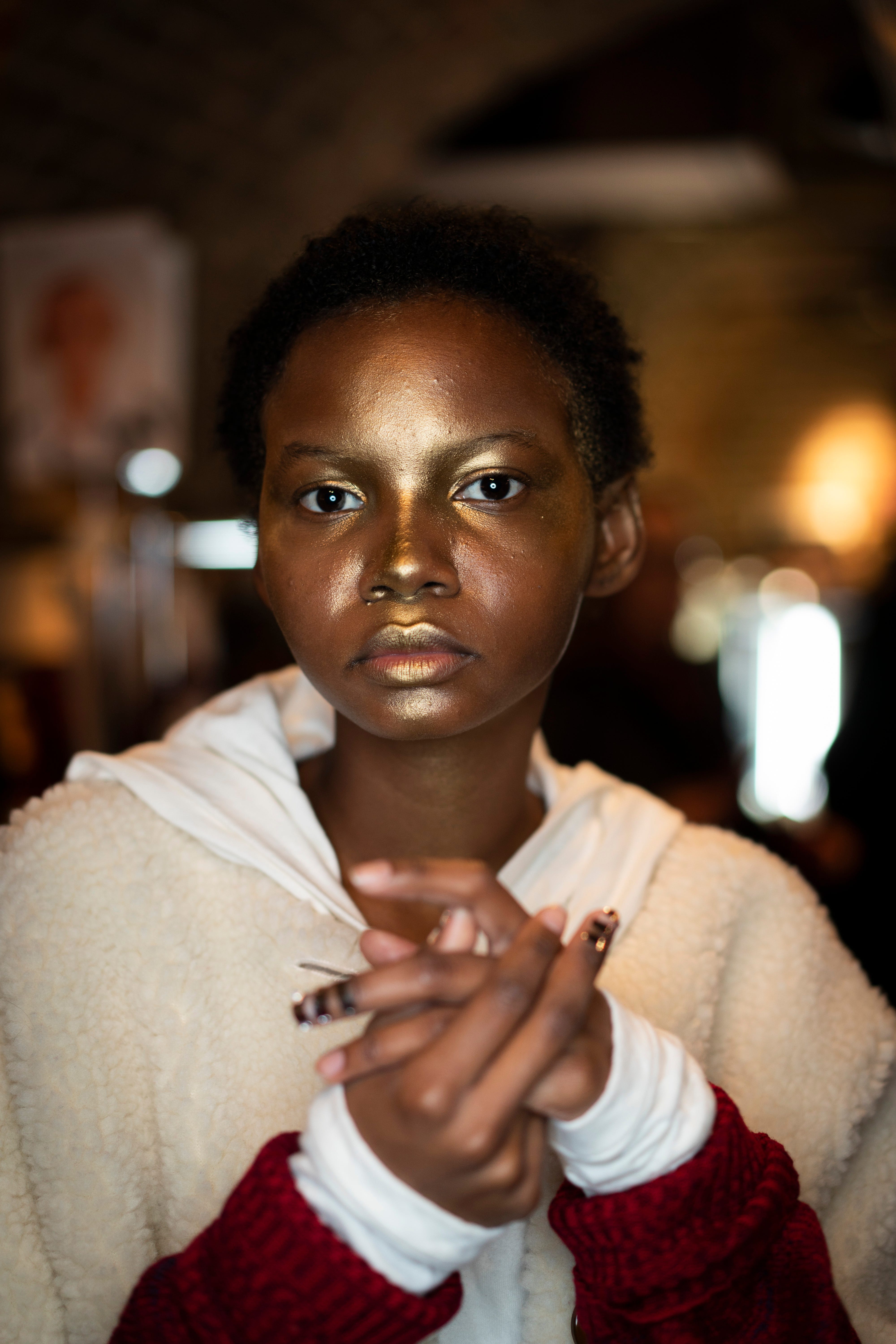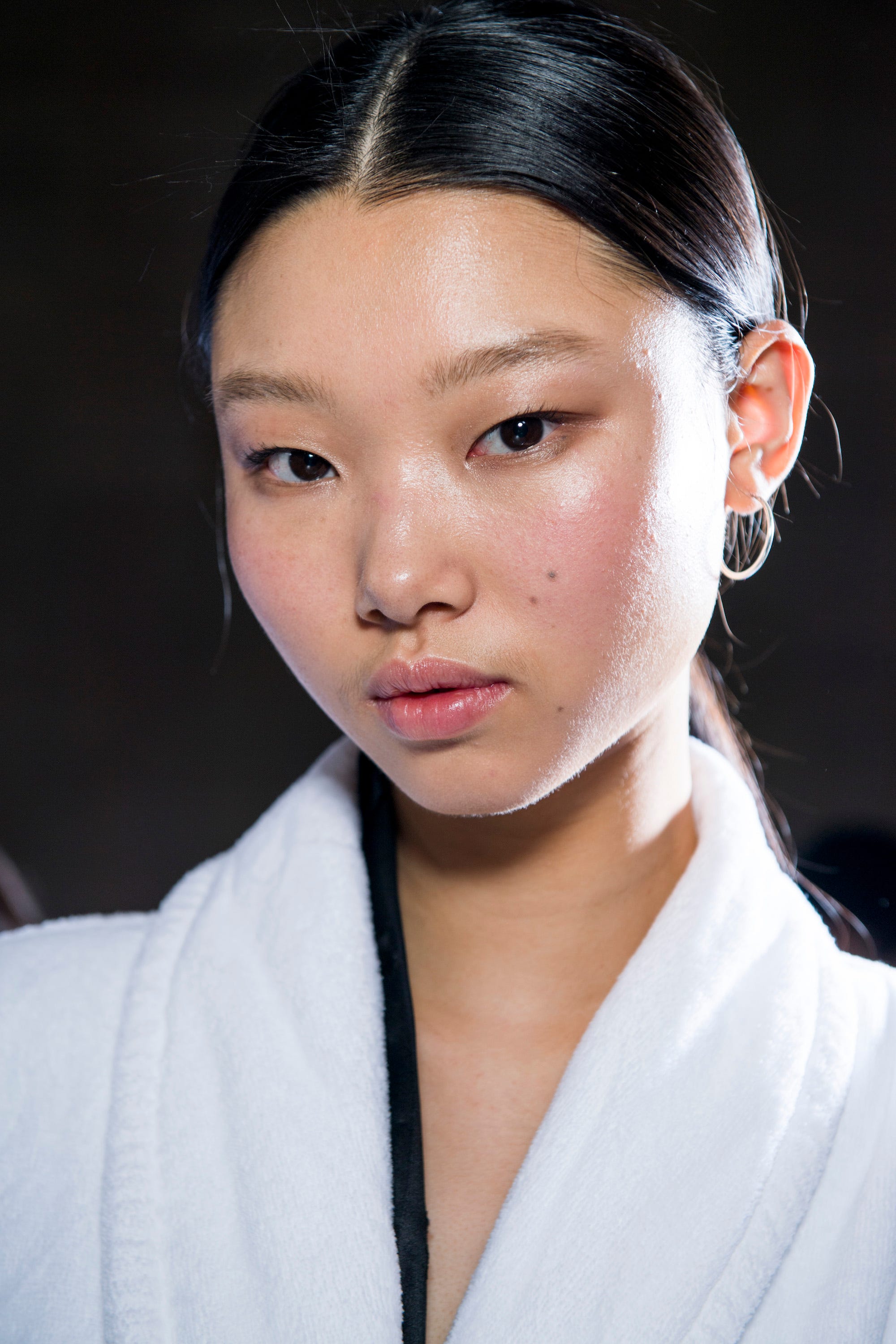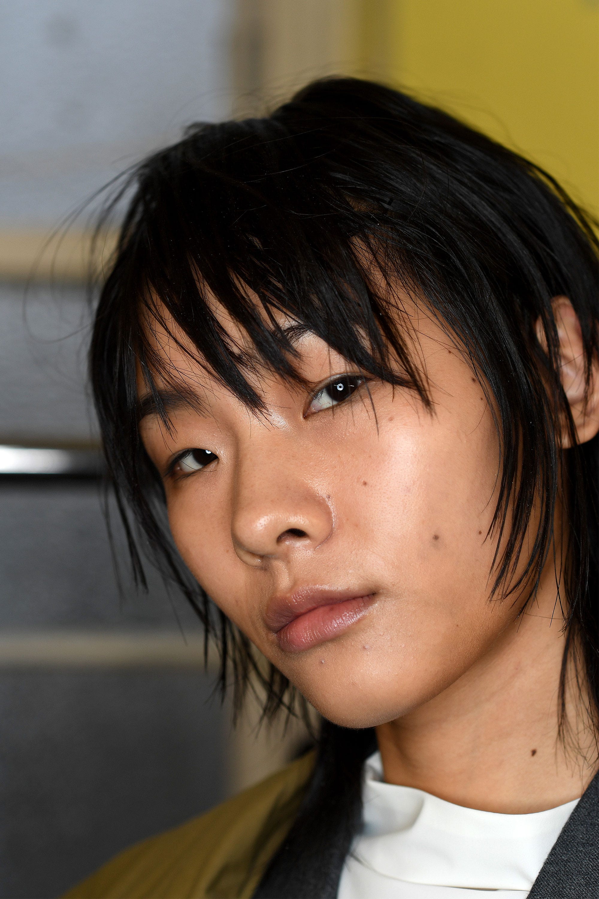 The makeup was barely there, thanks to Lynsey Alexander for KIKO. "Because of the hair statement, we pared the makeup back and made it iridescent and radiant," she said. "The key product is the KIKO Smart Radiance Cream 3-in-1, which we used as a translucent strobe for an otherwordly glow. We wanted the brows to be boyish and applied a bit of brown mascara to lashes give a deeper, darker lash that looks natural." Lyndsey also applied a touch of Sculpting Touch Creamy Stick Contour to the hollows of the cheeks for a slight shadow. "It's all about layers of makeup that still look like skin," said Lyndsey. "All we wanted to do was bring out the features."