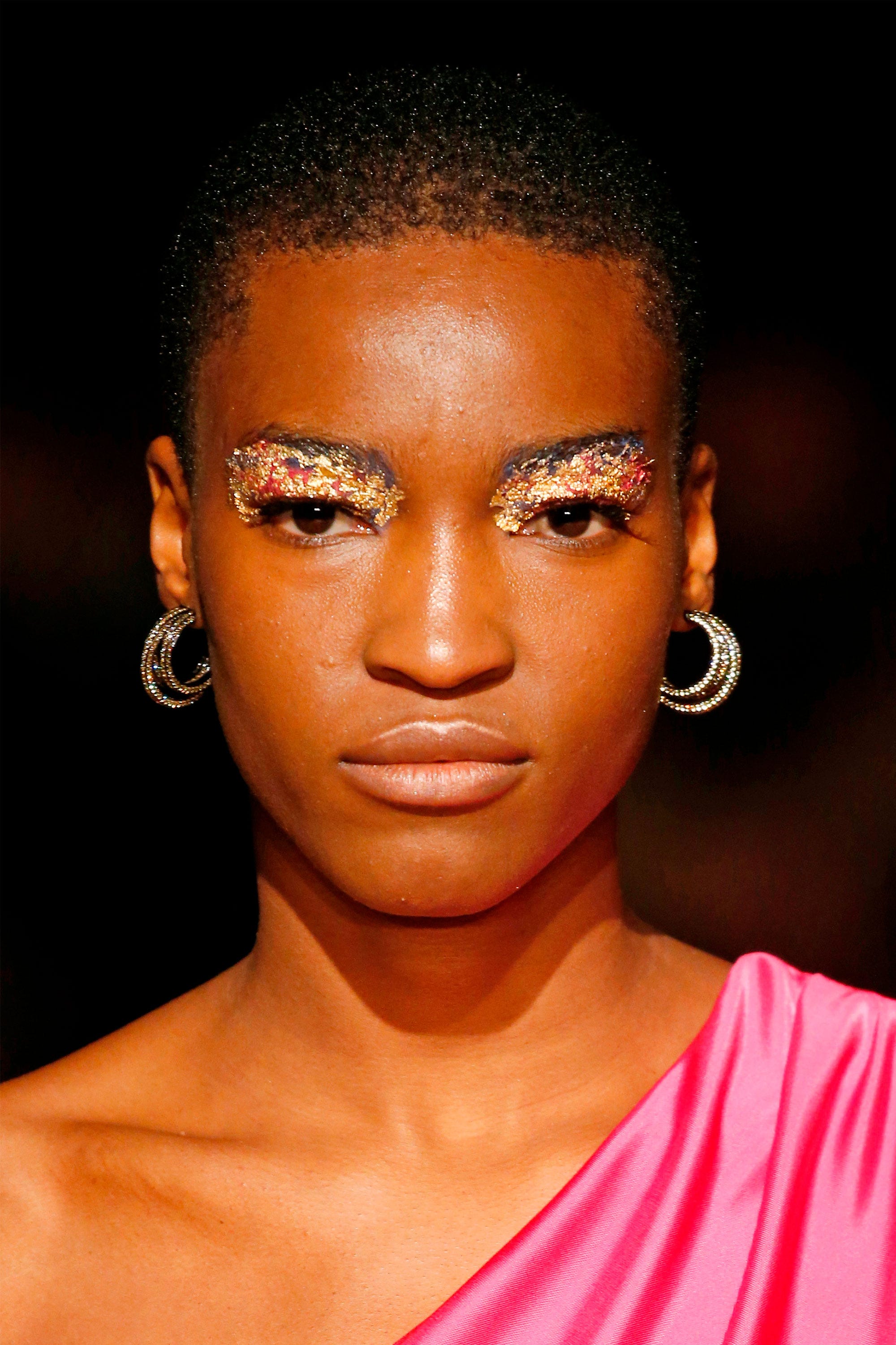 And the award for the biggest, baddest beauty look goes to Ashish. Straight from Vivienne Westwood, Isamaya Ffrench for MAC Cosmetics created this '70s disco-inspired, glitter-drenched makeup look by packing lids and lips with MAC Pigment. Makeup artists brushed away any stray flecks of glitter with a concealer brush, but precision didn't matter here.