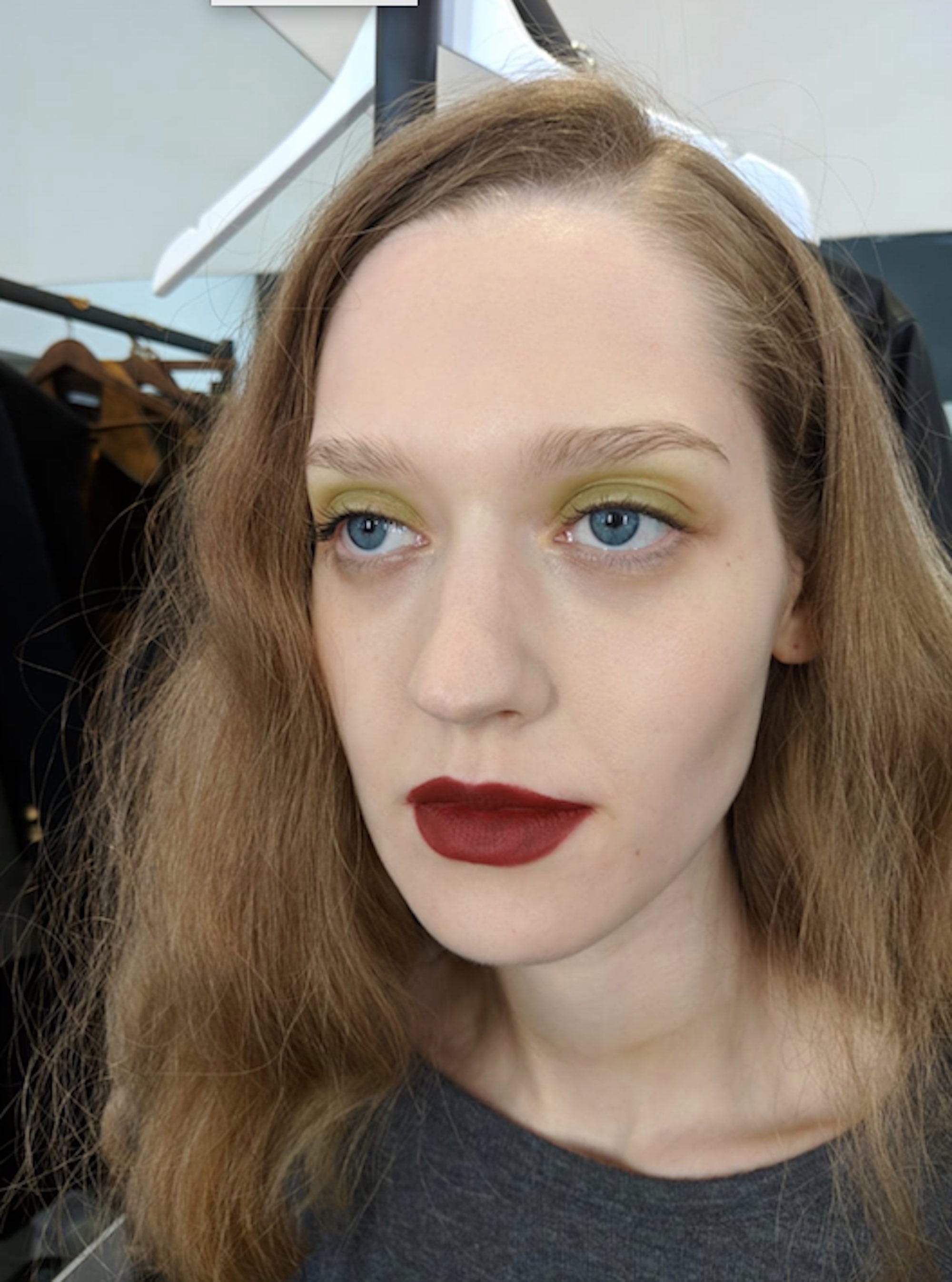 Hair was effortlessly pulled back and stylist Alex Brownsell used a unique tool to create a halo of natural-looking frizz – a balloon, which she rubbed on the hairline to produce static before styling and setting it with hairspray. The inspiration behind the look? "The hair has a carefree, Alexa vibe," said Brownsell, who employed L’Oréal Professionnel Tecni.Art Pli, L’Oréal Professionnel Tecni.Art Liss Control and L’Oréal Professionnel Infinium Soft Hold Hairspray. "It’s a girl who’s grown up in a cult and broken out to navigate her own style. We’re adding a bit of post-apocalyptic static energy."