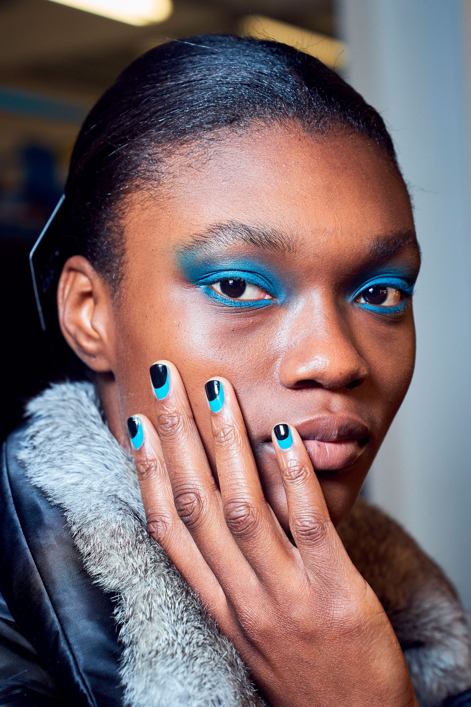 Eyes were teal, smoky and matched the manicures at House of Holland, thanks to Zoe Taylor for MAC Cosmetics, who blended eyeshadow right up to the brows and down to the lower lash line. Skin was simple save for a smidge of foundation.