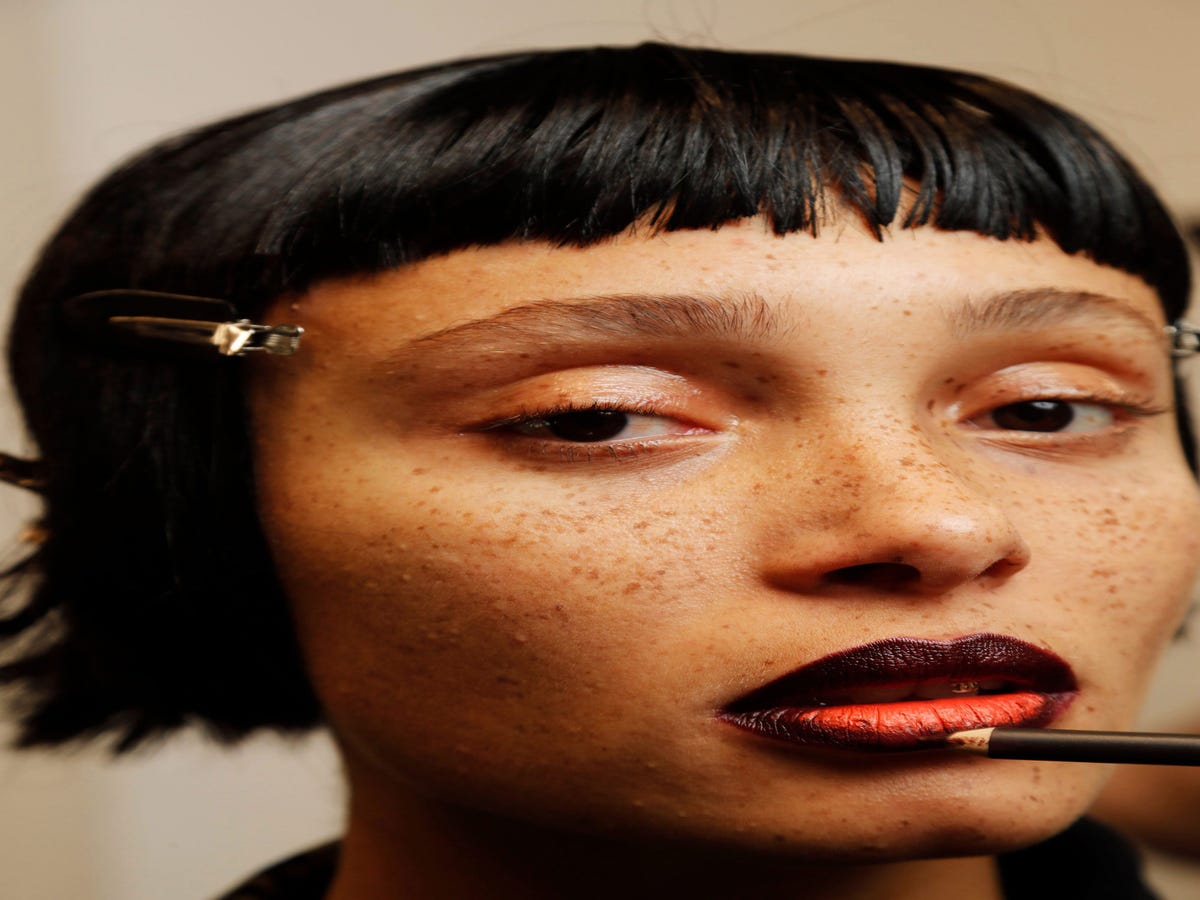 There were four looks at Richard Malone, but Pablo Rodriguez for Illamsqua had one clear favourite: overloaded mascara. "I applied mascara using a spatula," he told R29. "Once I applied one coat, I went in with heaps more on both the top and the bottom lashes. If it transferred, I just left it." When it came to skin, Pablo applied Illamasqua's Matte Veil as a skin base, but only if the models needed a little touching up. He left the skin bare otherwise. "I wanted this look to be about mascara to an extreme. Always add more."