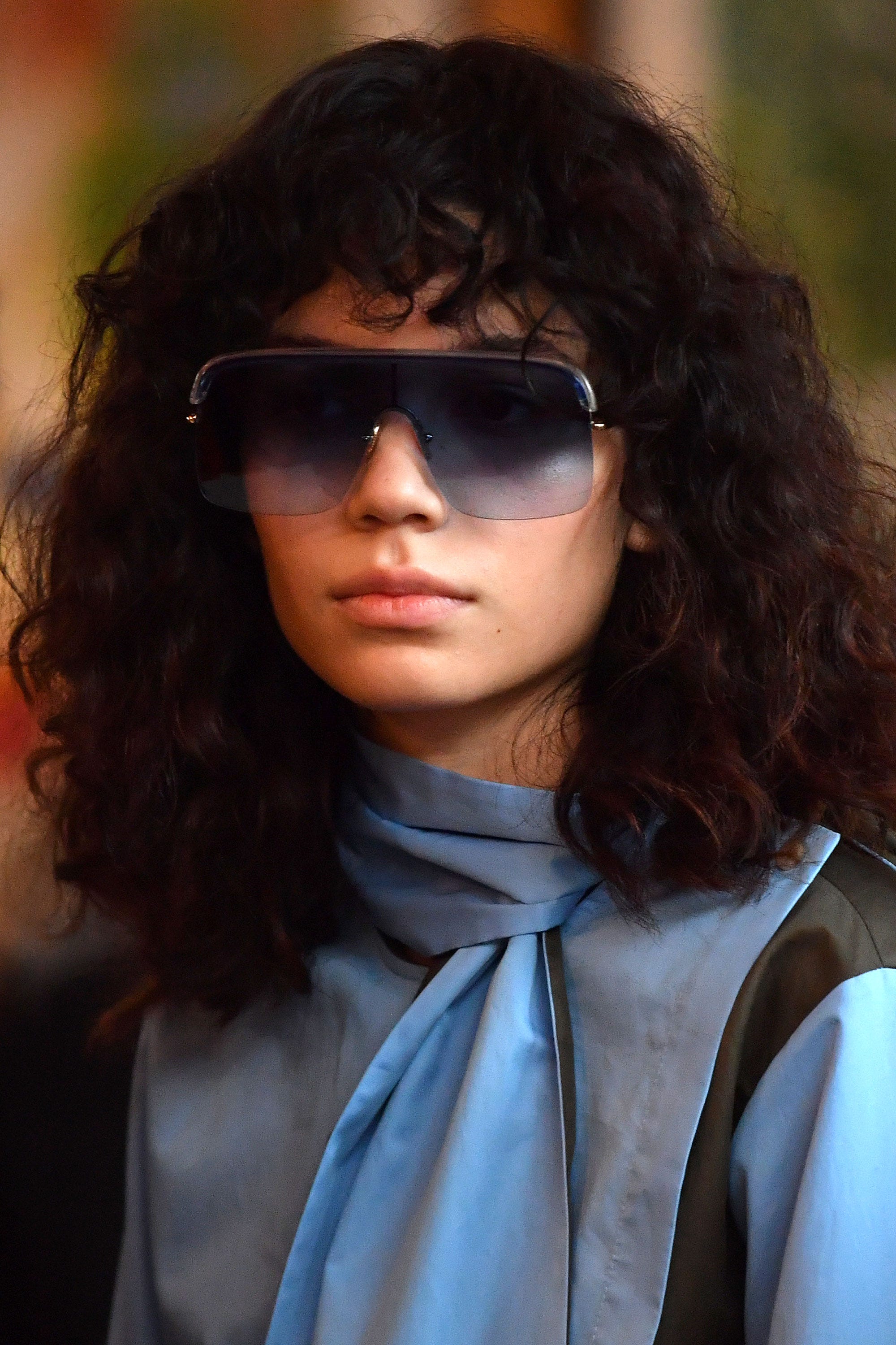 Hair at Eudon Choi took inspiration from the '70s with shaggy full fringes and brushed-out curls, courtesy of Davines. Micro-fringes similar to those spotted at Matty Bovan also made an appearance and makeup was minimal as models were sent down the catwalk wearing oversized, ski goggle-esque sunglasses.