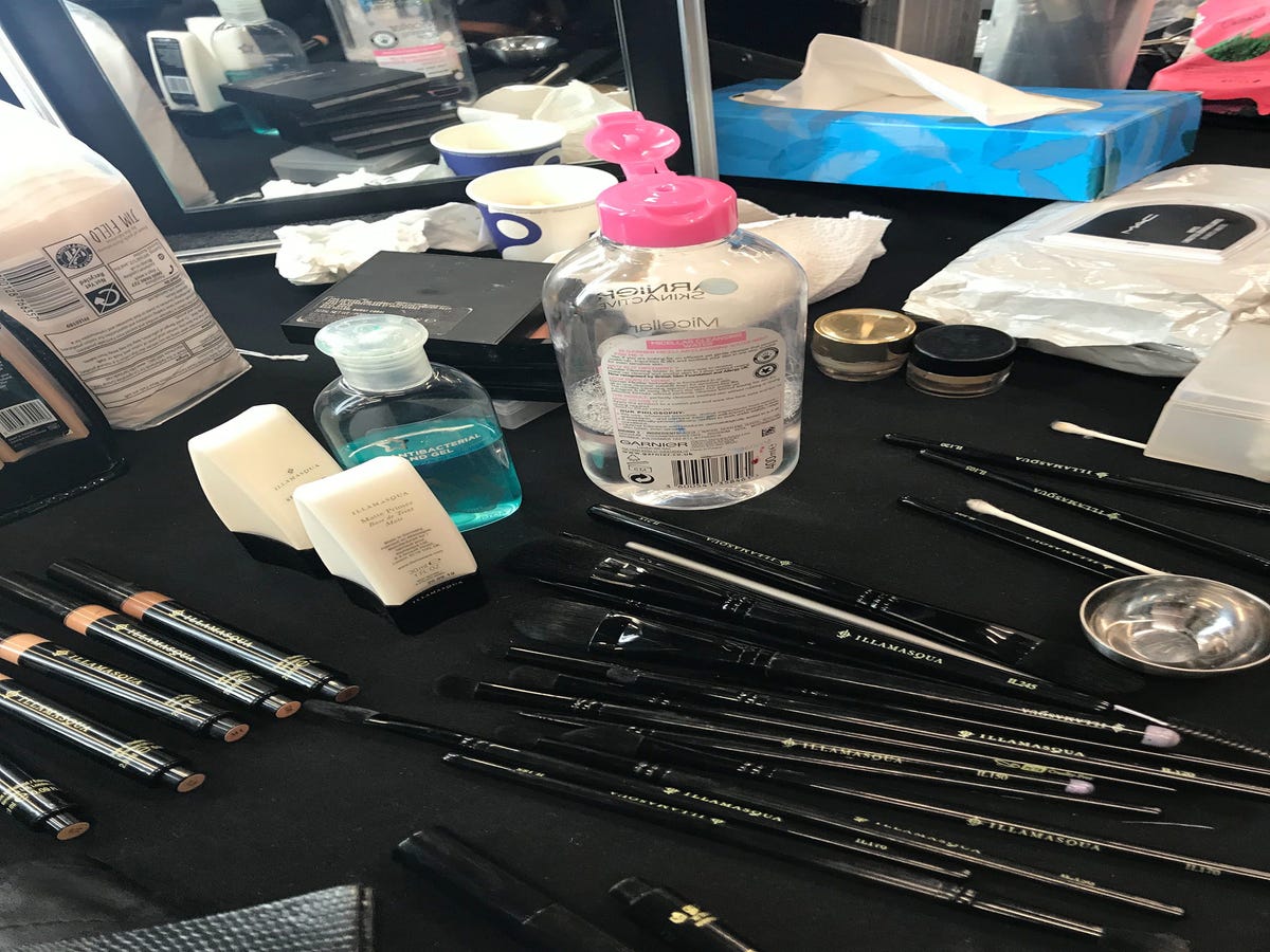 I skipped breakfast in favour of contouring (I am a beauty editor, after all) so I try and sneak a pastry from the buffet (actually for the models) but there are just crumbs left. Yes, they do eat. Instead, I make my way over to Pablo Rodriguez, Illamasqua’s global director of artistry and one of the nicest makeup artists I’ve met. I’m the only journalist in the room (bliss) and he explains all four beauty looks to me in detail while I riffle through his kit. You'd be surprised by how many high street and own-brand products pro makeup artists rely on, like Garnier Micellar Water Sensitive Skin, Superdrug Hand Sanitiser (presumably for cleaning brushes) and Duo Striplash. I grab a couple of pics then realise my storage is full. I deliberate deleting the hundreds of pictures of my cat doing cute things and telling everyone back at the office that my phone broke over the weekend so I couldn't take any photos. The PR sees me struggling with this decision and reassures me that all imagery will be sent straight to my inbox later today. Crisis averted, cat pictures safe.