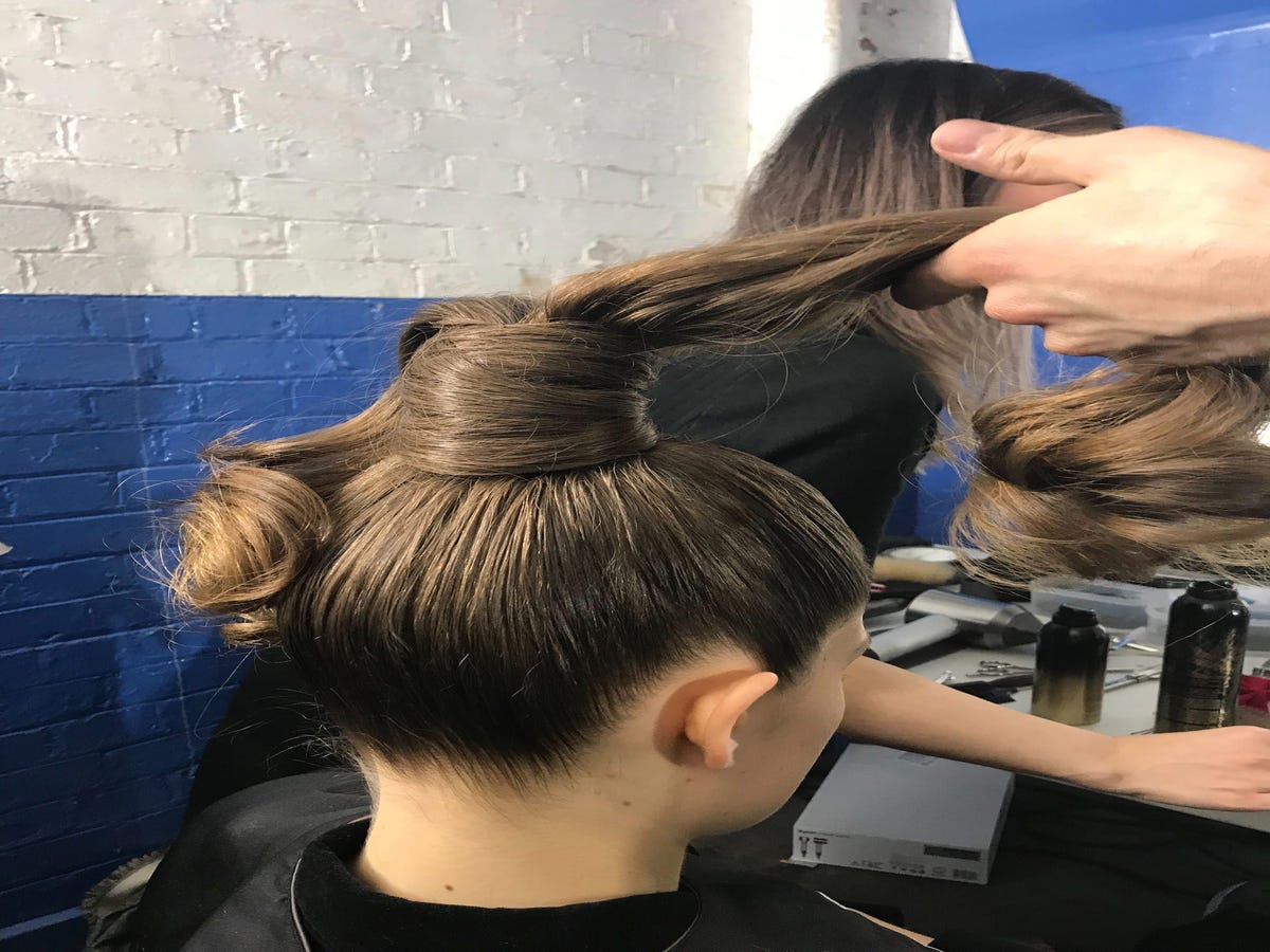 There’s a commotion as I walk into the venue because a hairstylist working another show next door is throwing a tantrum over a model’s finished hair, which he obviously is not impressed with. "No. No, no, just NO." It's all very The Devil Wears Prada, and I feel awful for the junior stylist who has to start from scratch, despite there being only 15 minutes left in hair and makeup. His model, who has been sitting in the chair for hours, is on the verge of wetting herself. I'm anxious.